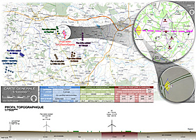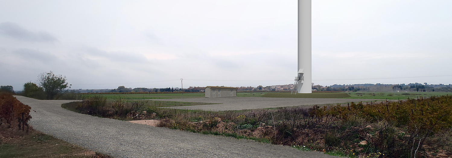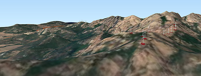 A partir des données de l’IGN et des caractéristiques des éoliennes, une maquette 3D est réalisée. Celui-ci inclue le Modèle Numérique du Terrain (MNT), les éoliennes en 3d dimensions et certains éléments remarquable qui serviront à calibrer les caméras. Le contexte éolien est également modélisé (parcs existants, autorisés et en projet). De cette maquette, le profil est extrait pour accompagner les planches de synthèse.